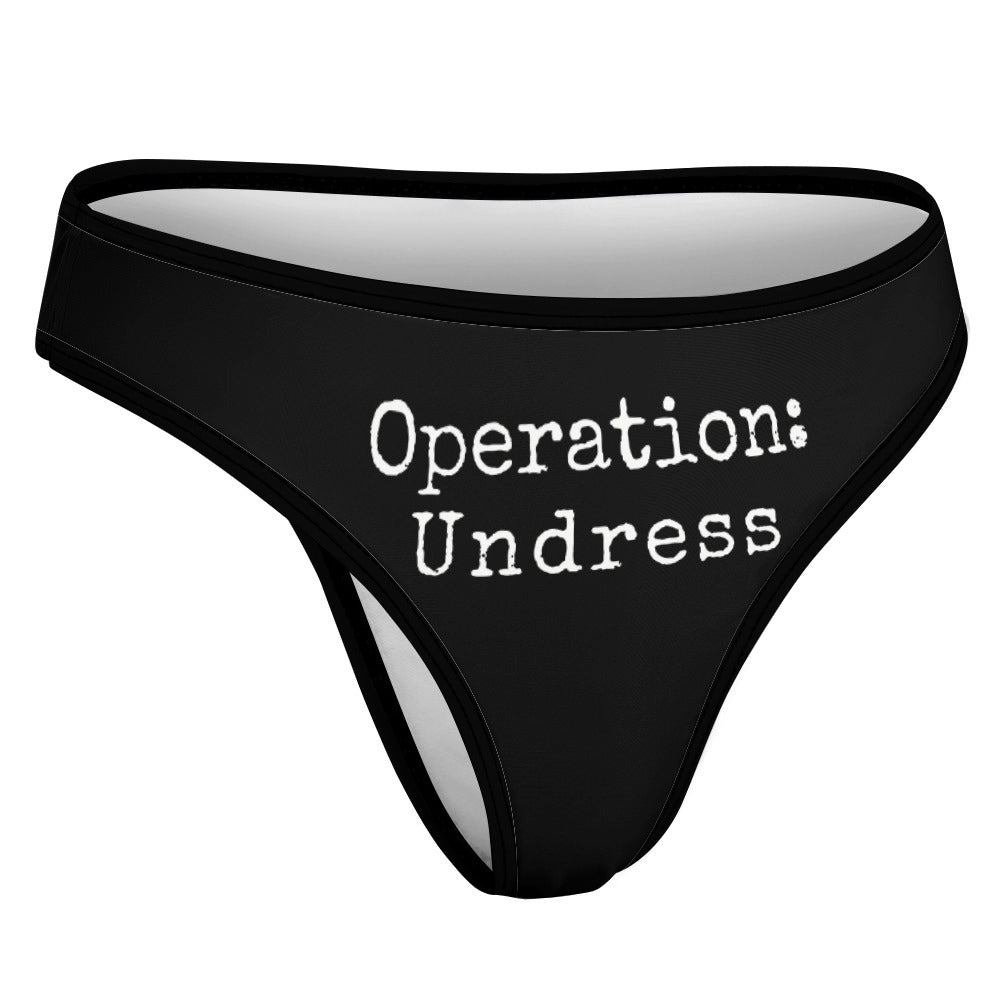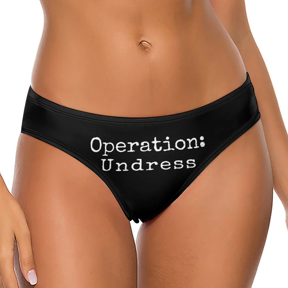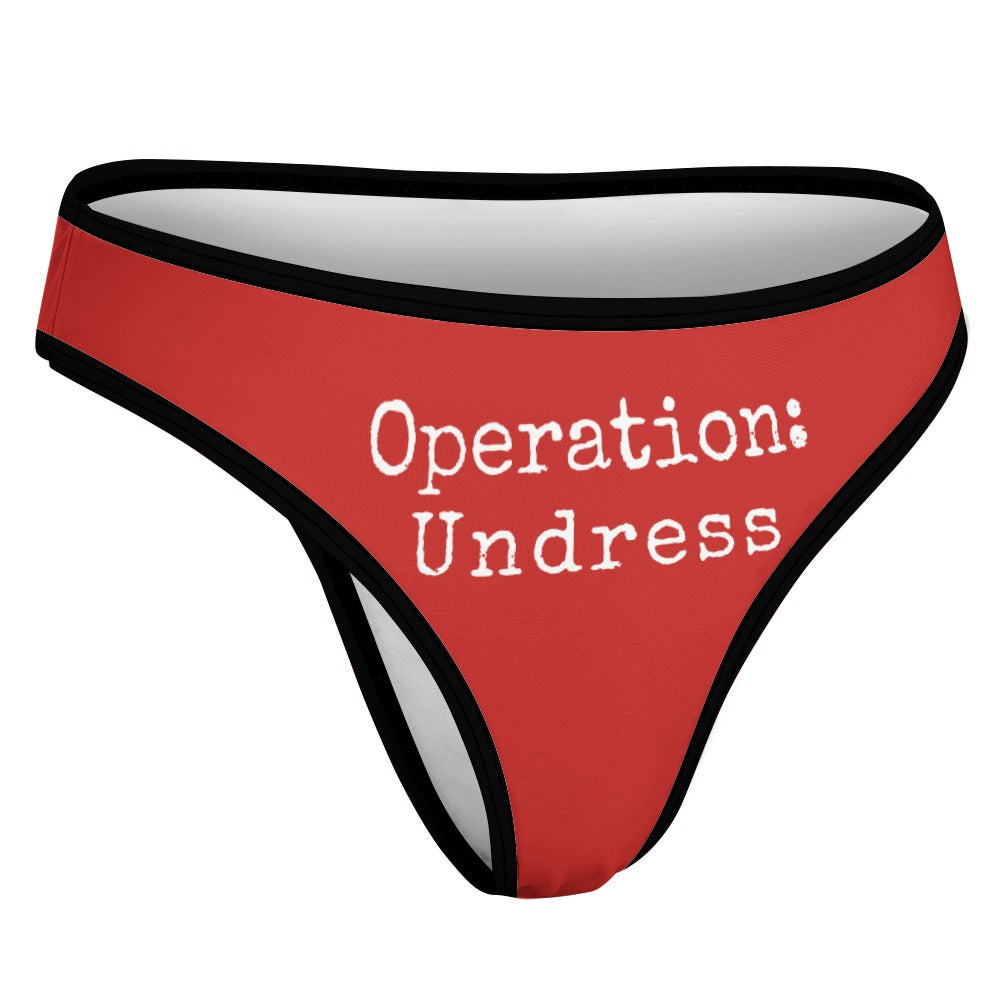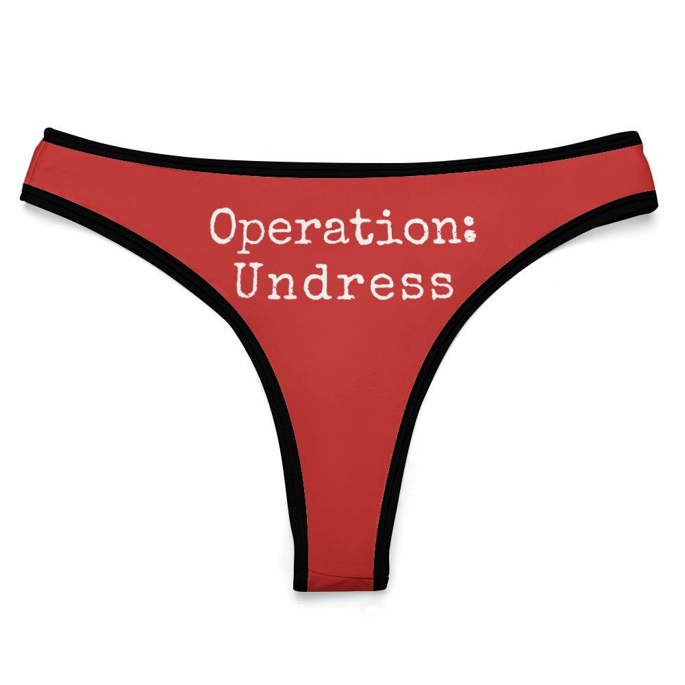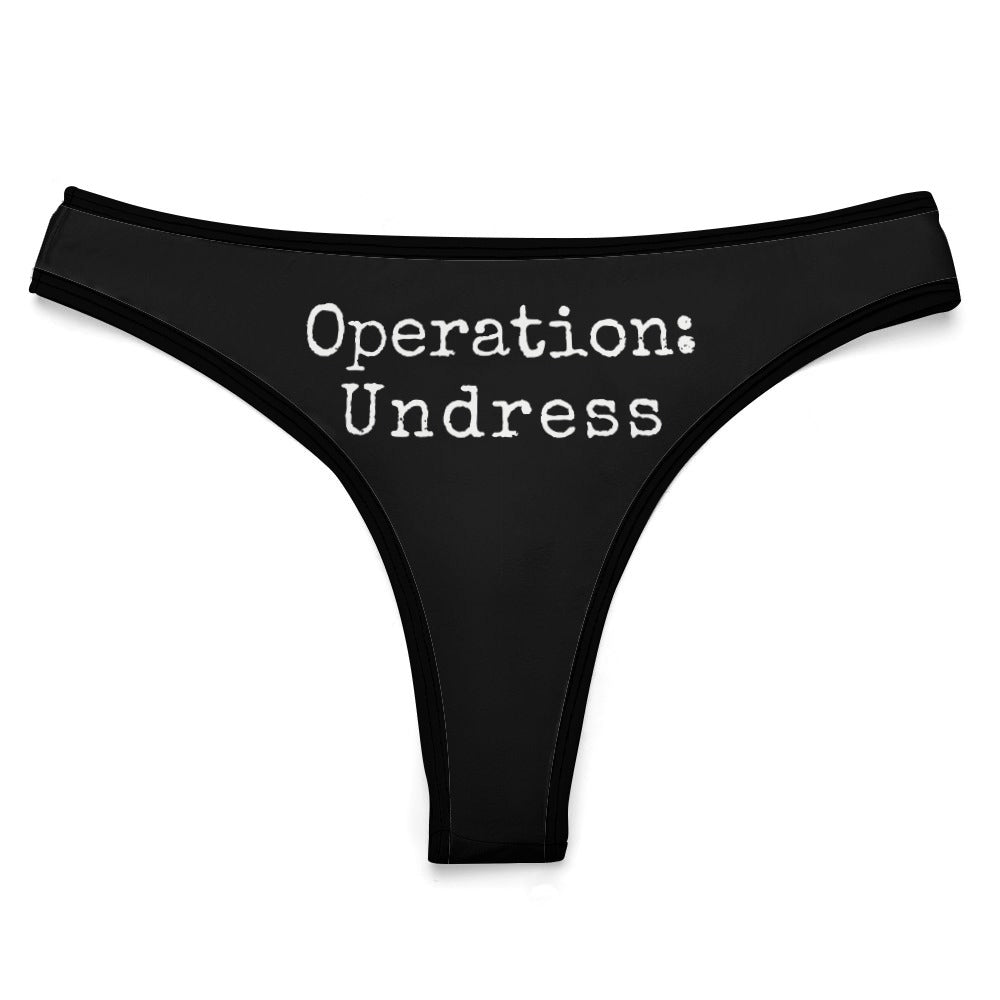 With its elastic waistband and curve-hugging fit, it flatters every shape while staying comfortable all day. The breathable, skin-friendly inner lining keeps you fresh, while the bold slogan “Operation: Undress” ensures laughs (and maybe a little blushing).