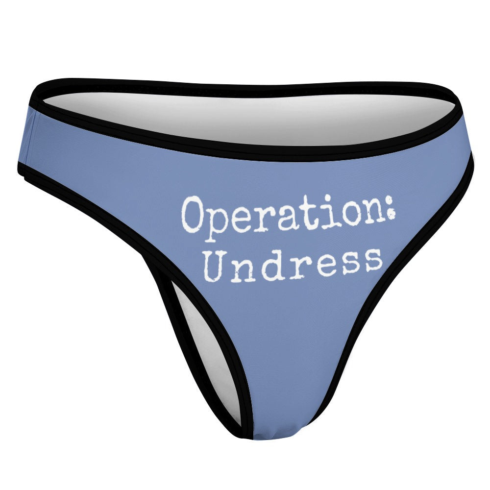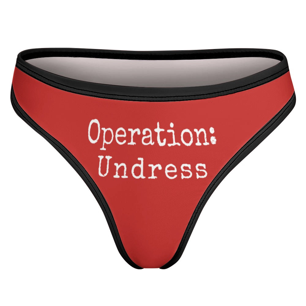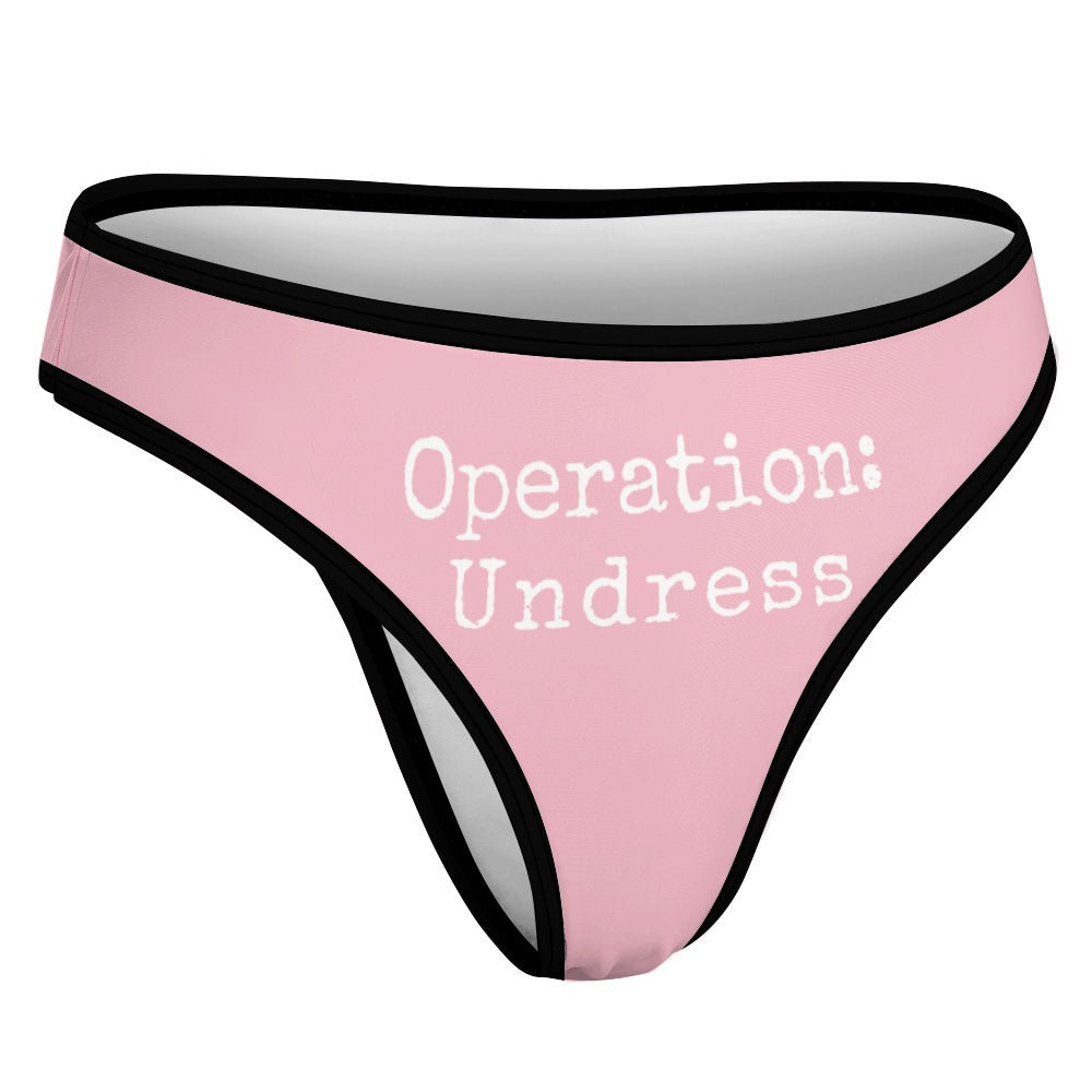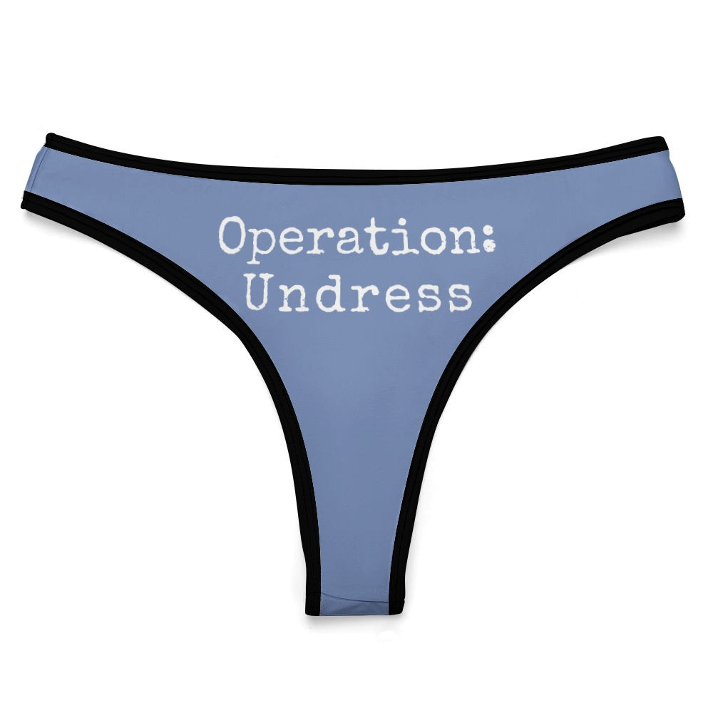 With its elastic waistband and curve-hugging fit, it flatters every shape while staying comfortable all day. The breathable, skin-friendly inner lining keeps you fresh, while the bold slogan “Operation: Undress” ensures laughs (and maybe a little blushing).