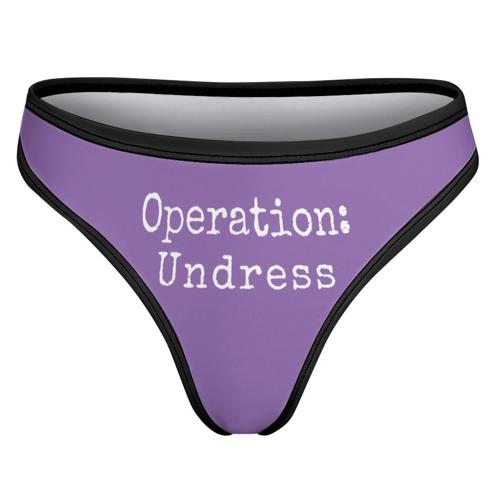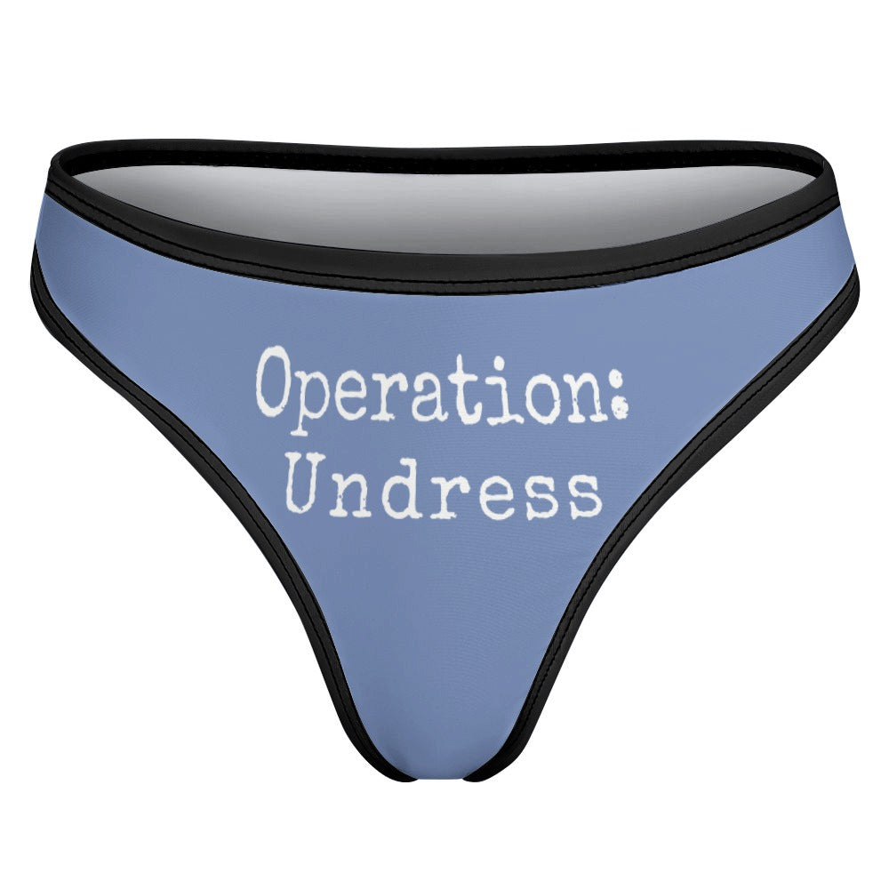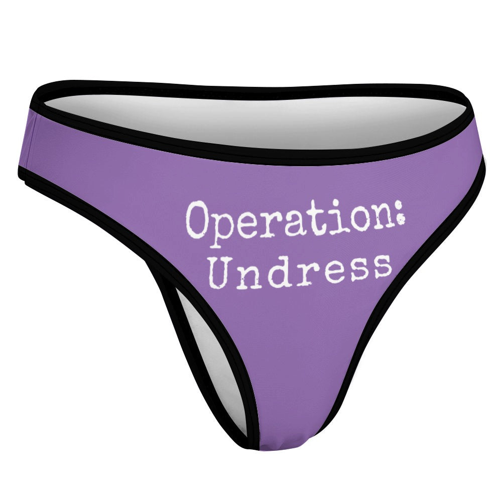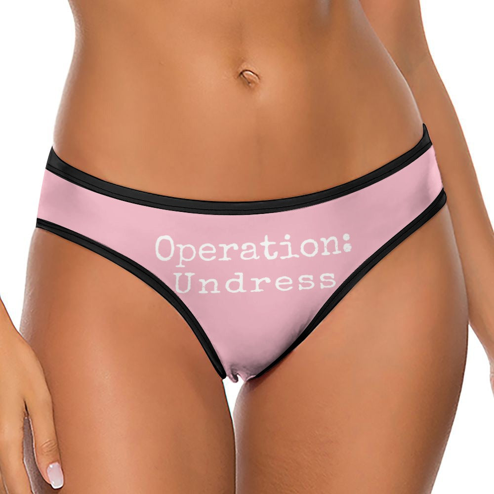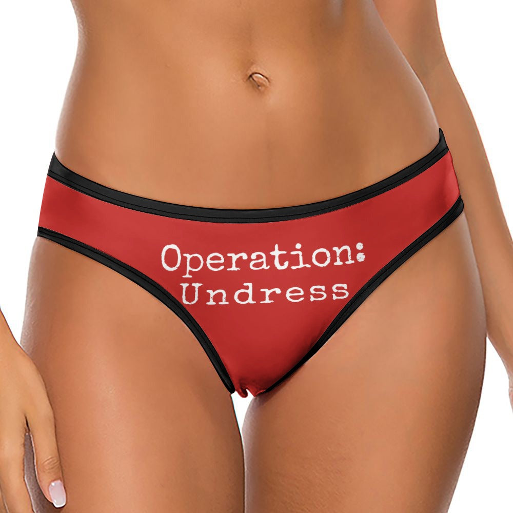 With its elastic waistband and curve-hugging fit, it flatters every shape while staying comfortable all day. The breathable, skin-friendly inner lining keeps you fresh, while the bold slogan “Operation: Undress” ensures laughs (and maybe a little blushing).